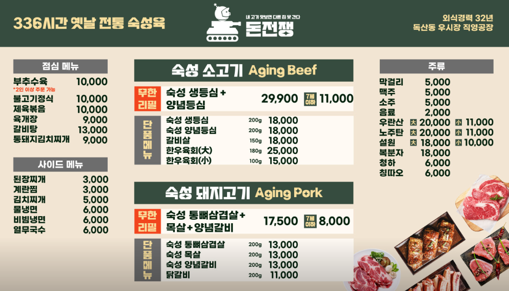 - 숙성 통뼈삼겹살, 숙성 목살, 양념갈비, 숙성 등심, 돼지껍데기까지 5가지 돼지고기를 무한리필로 즐길 수 있습니다.