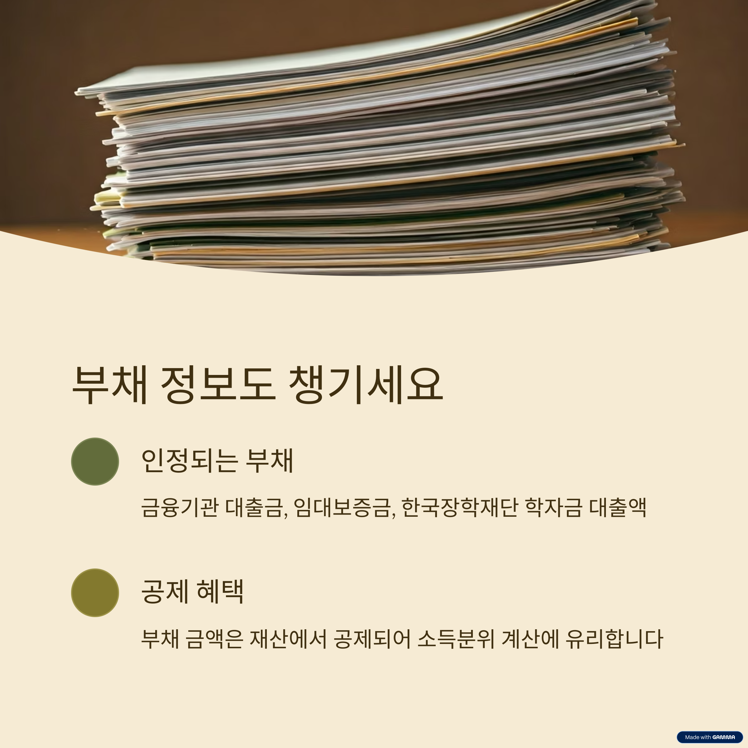 - 금융기관 대출금, 임대보증금, 한국장학재단 학자금 대출액 등