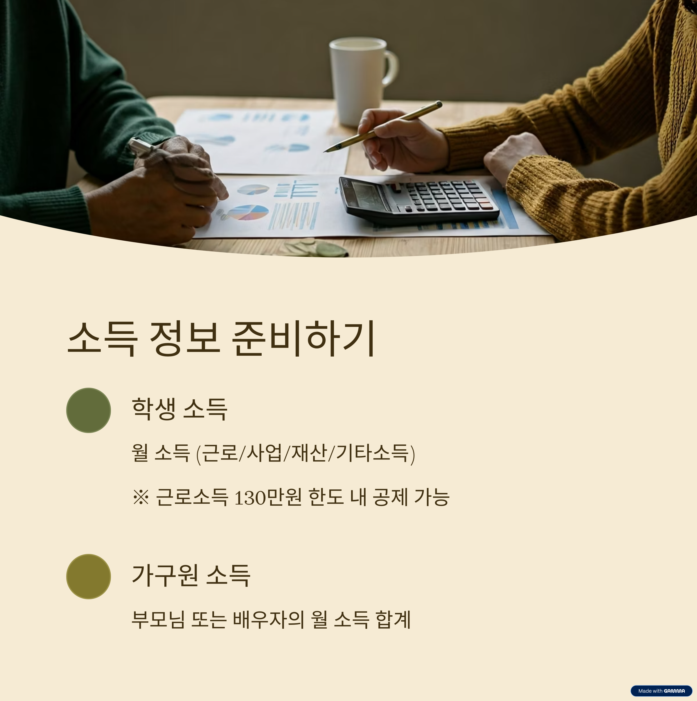 - 가구원 소득: 부모님 또는 배우자의 월 소득 합계