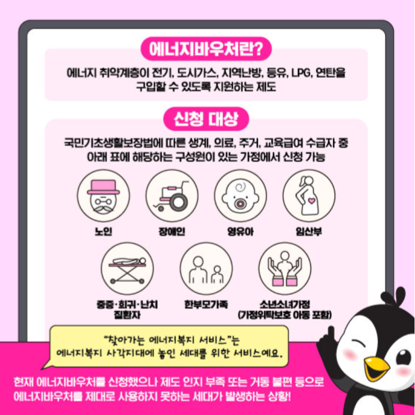 - 지원 대상: 에너지 취약계층 (소득기준 및 세대원 특성기준 충족)